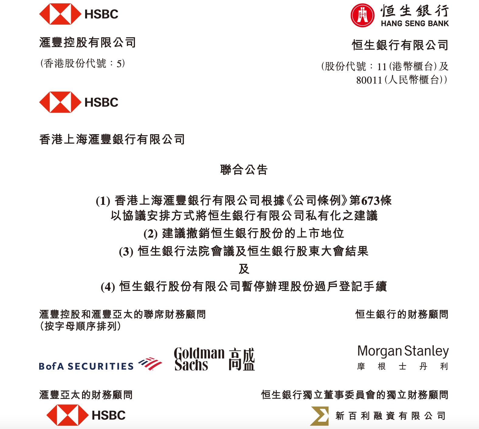 1月8日,据汇丰控股(00005.HK)与恒生银行(00011.HK)联合公告,汇丰将恒生银行私有化的建议获恒生银行法院会议、恒生银行股东大会表决通过。预计恒生银行于香港联交所的上市地位将于1月27日被撤销。