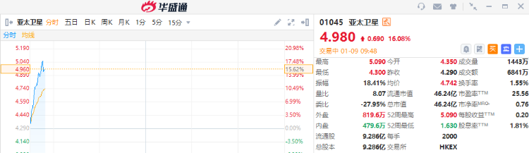 港股商业航天概念股持续走强!截至发稿,亚太卫星涨超16%,钧达股份涨超12%,金风科技涨超11%,航天控股涨超5%。