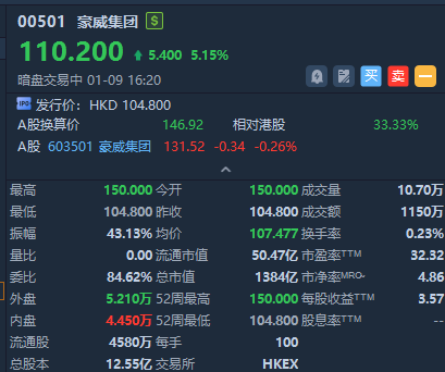 华盛资讯01月09日讯,港股豪威集团正在暗盘交易中,截至发稿涨超5%,报110.2港元/股,中签一手账面浮盈540港元,最新总市值超1384亿港元。该股预计将于1月12日正式挂牌上市,配售结果将于今日晚间披露。