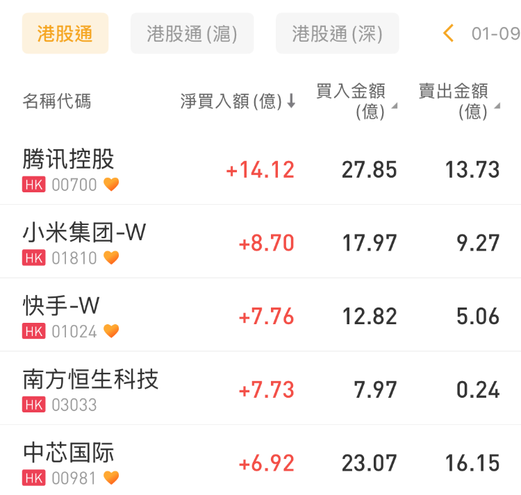 腾讯控股、小米集团-W、快手-W分别获净买入14.12亿港元、8.7亿港元、7.76亿港元;