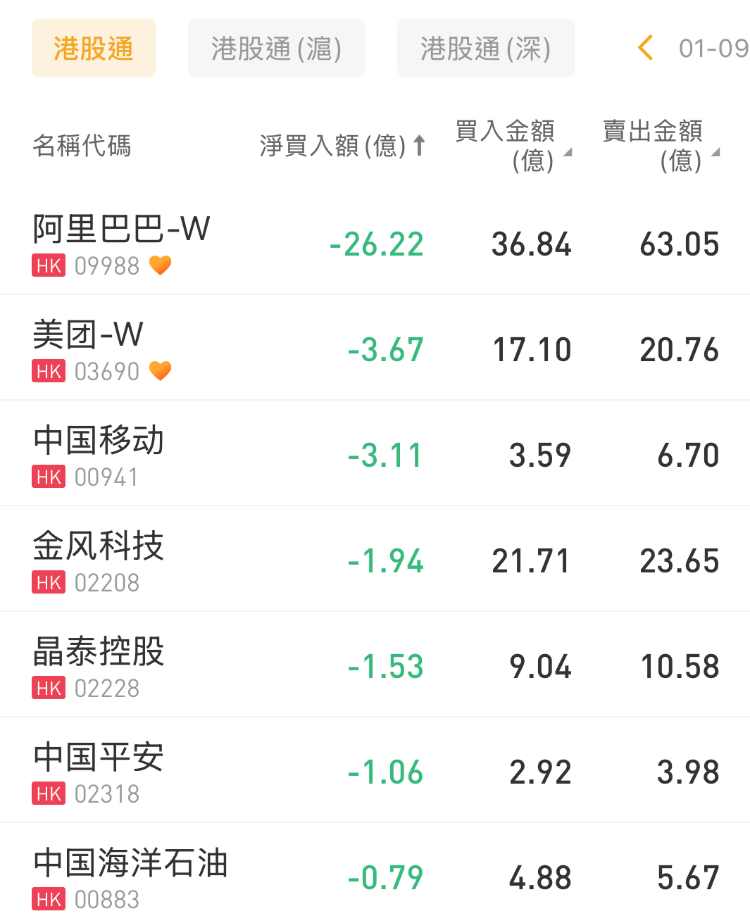 阿里巴巴-W、美团-W、中国移动分别遭净卖出26.22亿港元、3.67亿港元、3.11亿港元。