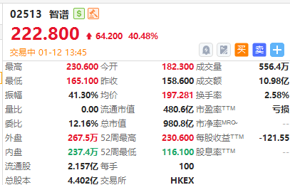 智谱午后涨超40%,较招股价116.2港元已接近翻倍,总市值一度突破1000亿港元。截至发稿,涨40.48%,报222.8港元,成交额10.98亿港元。