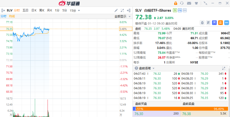 贵金属概念股普涨,白银ETF $SLV 盘前涨超5%,两倍做多白银ETF $AGQ 涨超11%,泛美白银涨超7%,黄金ETF $GLD 盘前涨超2%。