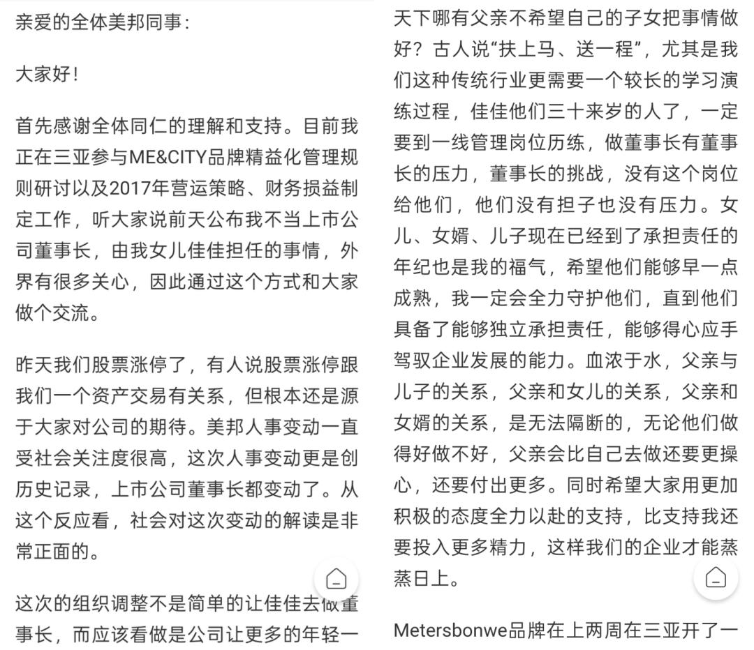 2024年1月5日,美邦服饰公告称,胡佳佳因个人原因辞去公司第六届董事会董事长、董事及各专门委员会职务。 随后在1月22日,胡佳佳进一步辞去公司总裁职务。