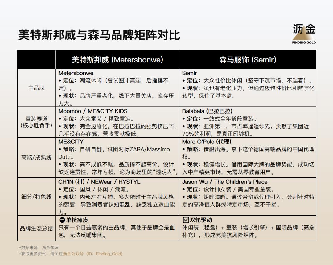 反观美邦,除了那个日益老化的Metersbonwe,剩下的只有一堆定位模糊的子品牌。