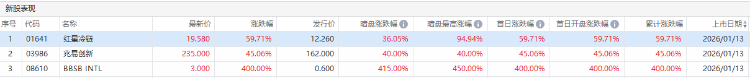 港股红星冷链今日挂牌,截至发稿涨59.71%,报19.58港元/股,中签一手账面浮盈3660.0港元,最新总市值超19.24亿港元。