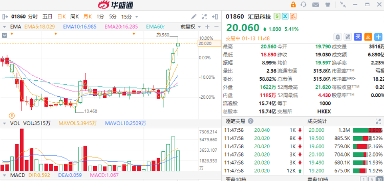 1月13日讯,汇量科技(01860)午前涨近8%,截至发稿,涨6.04%,报20.18港元,成交额6.8亿港元。