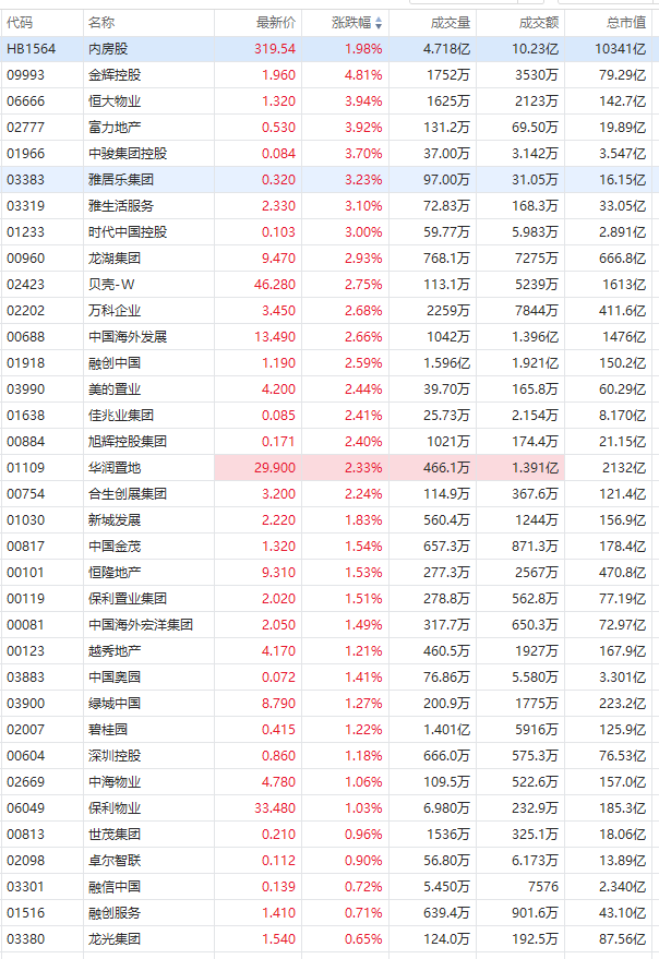 内房股涨幅居前,截至发稿,龙湖集团、万科企业大涨近3%,华润置地、新城发展涨约2%,越秀地产、绿城中国、碧桂园涨超1%。