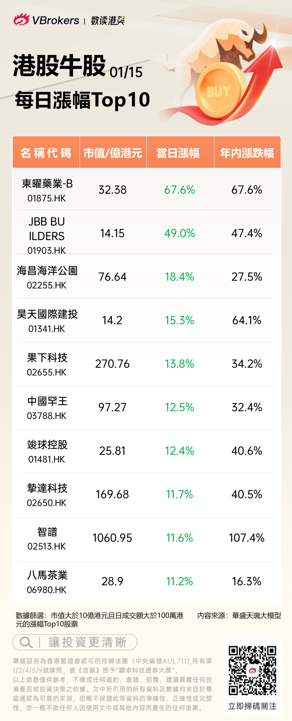 發仔统计了每日港股涨幅Top10,具体名单如下: