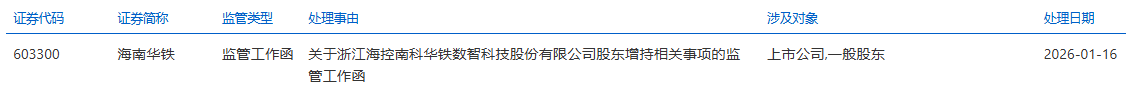 1月16日,海南华铁(603300.SH)收到上交所监管工作函,处理事由:关于浙江海控南科华铁数智科技股份有限公司股东增持相关事项,涉及对象:上市公司,一般股东。