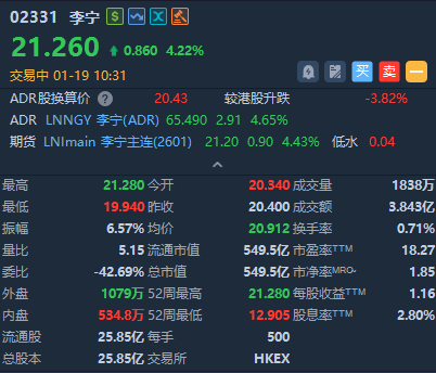 李宁再涨超4%,截至发稿,报21.26港元,成交额3.84亿港元。