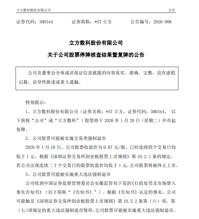 1月19日,*ST立方(300344.SZ)公告称,由于公司股票已连续四个交易日收盘价低于1元,可能被实施交易类强制退市。同时,公司收到《行政处罚及市场禁入事先告知书》,可能触及重大违法强制退市情形。此外,公司2024年度财务报告被出具否定意见的审计报告,且年审会计师正在立案调查中,可能无法完成2025年年报审计工作。