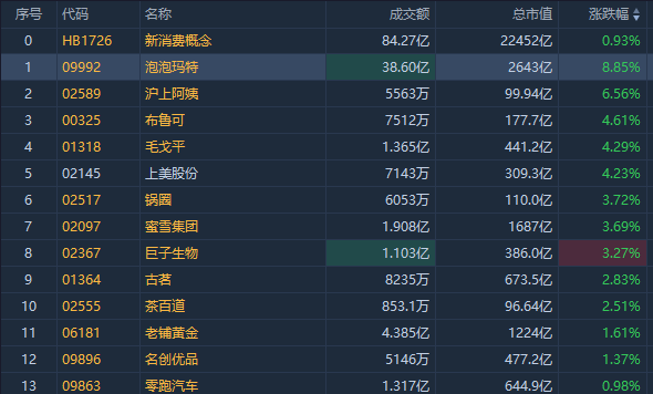 新消费概念股回暖,截至发稿,泡泡玛特涨超8%,沪上阿姨涨超7%,布鲁可涨超4%,锅圈涨超3%,老铺黄金涨超1%。