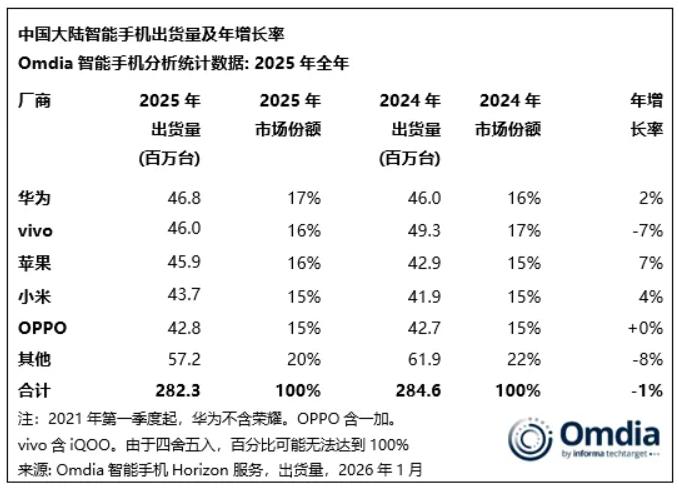 有趣的是,这一变化背后最直接的动因是市场防御与份额争夺。据Omdia最新发布的研究报告显示,2025年中国大陆智能手机市场全年出货量达2.823亿台,同比小幅下滑1%。