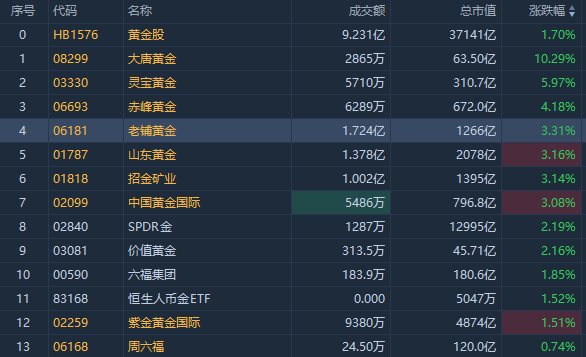 港股黄金股走强,截至发稿,大唐黄金涨超10%,灵宝黄金涨超5%,赤峰黄金涨超4%、中国黄金国际、招金矿业、山东黄金涨超3%。