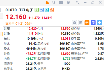 TCL电子高开一度涨近15%,截至发稿,涨11.66%,报12.16港元,成交额1.522亿港元。