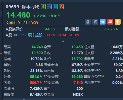 顺丰同城涨超18% ,月内累涨约三成,报14.48港元,成交额超2.26港元。
