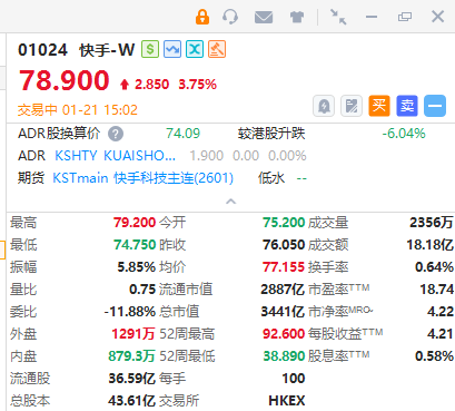 快手-W午后涨超4%。截至发稿,涨近4%,报78.75港元,成交额16.49亿港元。