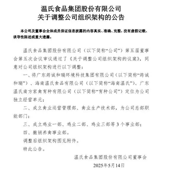 与此同时,在2025年5月,温氏发布公告,撤销原养禽事业部,新设三个事业部,肉鸡业务在组织架构中的权重被进一步拉高。