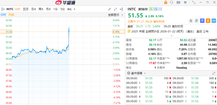 华盛资讯1月21日讯,半导体股集体走高,CPU概念股早盘集体大涨!英特尔涨超6%,AMD涨超2%。