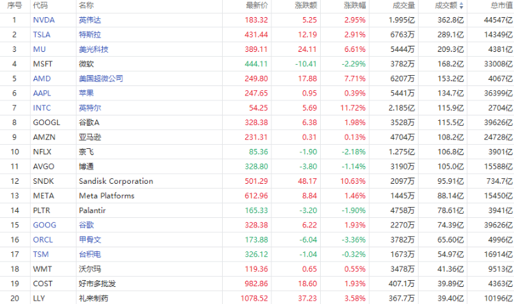 第3名美光收高6.61%,股价创历史新高,成交208.87亿美元。美光收购台湾晶圆厂获投行看好,Stifel称其实现“战略跃升”。
