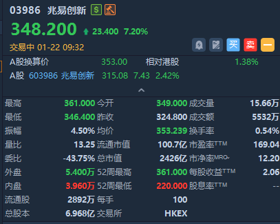兆易创新高开逾7%,高见349港元较招股价累涨1.15倍。截至发稿,涨7.2 $%,报348.2港元,成交额5532万港元。