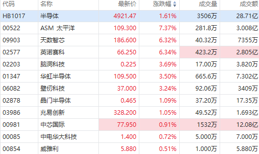 英诺赛科、天数智芯涨超6%、华虹半导体、壁仞科技涨超3%,中芯国际涨约1%;