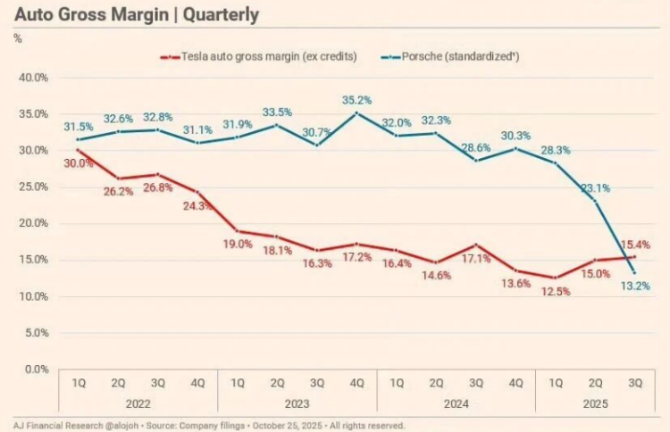 今年1月初,特斯拉官方通过X平台公布最新交付数据:2025年Q4交付量41.8万辆,同比下降15.6%,连续第二年出现销量下滑。这一交付数据不仅低于分析师预期,也未达到特斯拉此前设定的目标,并由此引发投资者对汽车业务营收增长的担忧。