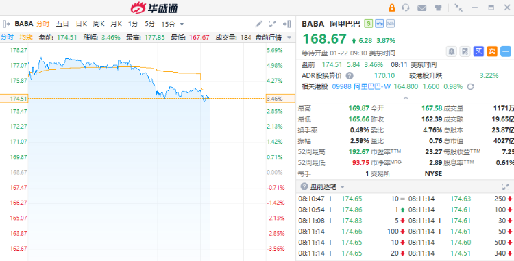 阿里巴巴美股盘前一度涨超5%,现涨超3%。彭博社周四援引知情人士消息报道,中国电商巨头阿里巴巴正筹备推动旗下芯片制造业务平头哥半导体启动首次公开募股(IPO)。
