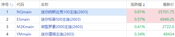 特朗普隔夜称与北约达成格陵兰协议“框架”、暂不对欧加关税;美股三大期指周四盘前集体反弹,纳指期货 $NQmain 涨0.91%,标普500期货 $ESmain 涨0.57%,道指期货 $YMmain 涨0.34%。