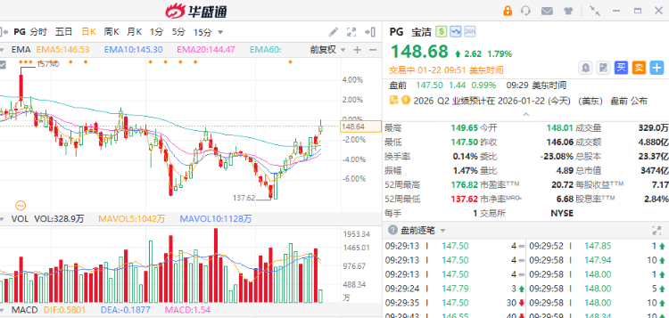 华盛资讯1月22日讯,宝洁绩后涨近2%,公布2026财年Q2业绩,公司Q2营收222.08亿美元,同比增长1.5%,归母净利润43.19亿美元,同比下滑6.7%。