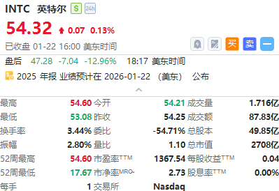 英特尔第四季度营收136.7亿美元,同比减少4.1%,市场预估134.3亿美元;第四季度调整后每股收益0.15美元,上年同期0.13美元,预估0.09美元。英特尔预计第一季度调整后每股收益0.0美元,市场预估0.08美元;预计第一季度营收117亿美元至127亿美元,市场预估125.6亿美元。