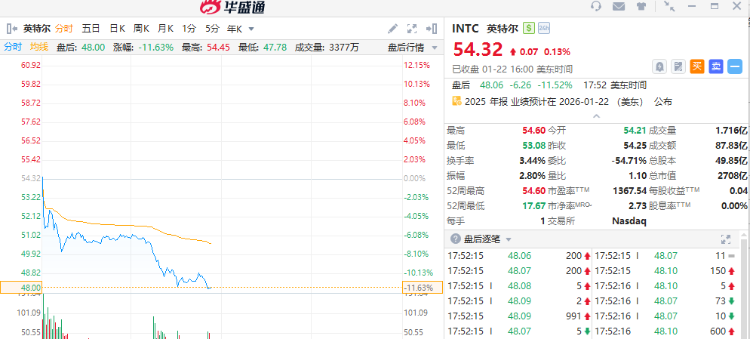 英特尔预计第一季度调整后每股收益0.0美元,市场预估0.08美元;预计第一季度营收117亿美元至127亿美元,市场预估125.6亿美元。截至发稿,英特尔盘后大跌超11%。
