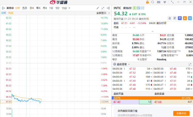 英特尔绩后暴跌12%,公司第四季度营收同比下降4.1%,超出华尔街预期,但一季度业绩指引远逊预期。