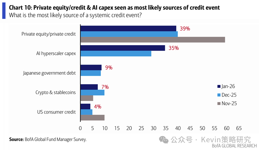 3. 对地缘政治担忧上升,28%的人认为地缘冲突是最大的尾部风险,其次是AI泡沫(27%);39%的人认为私人信贷仍最有可能是信用风险来源(vs. 12月40%)