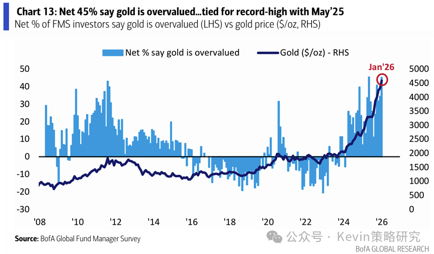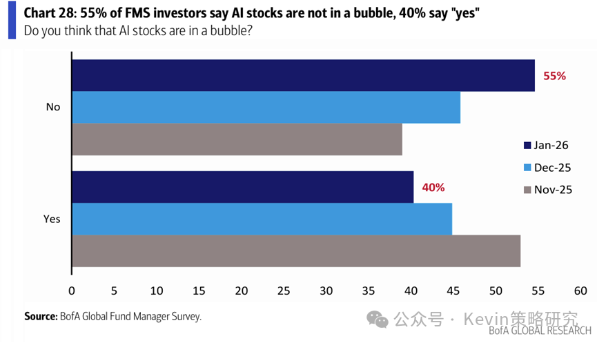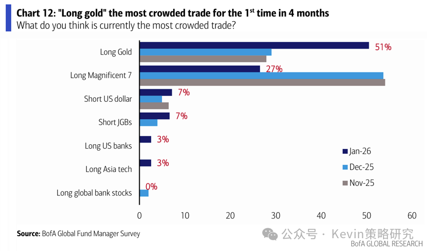 3. 做多黄金重新成为最拥挤的交易(51% vs. 12月29%),其次是做多“科技七姐妹”(27% vs. 12月54%)。45%的人认为黄金被高估,55%的人认为AI不存在泡沫