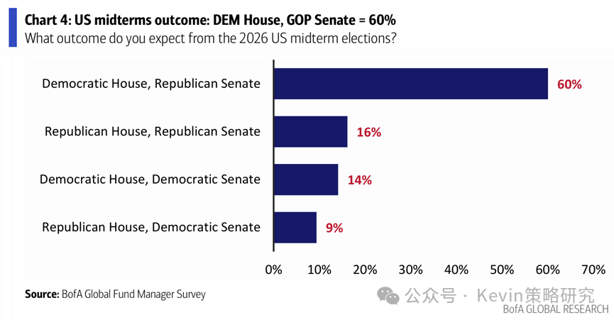 4. 60%的人认为美国中期选举民主党控制众议院,共和党控制参议院;认为哈塞特将被提名为美联储新主席的人比上个月减少(44% vs. 12月69%)
