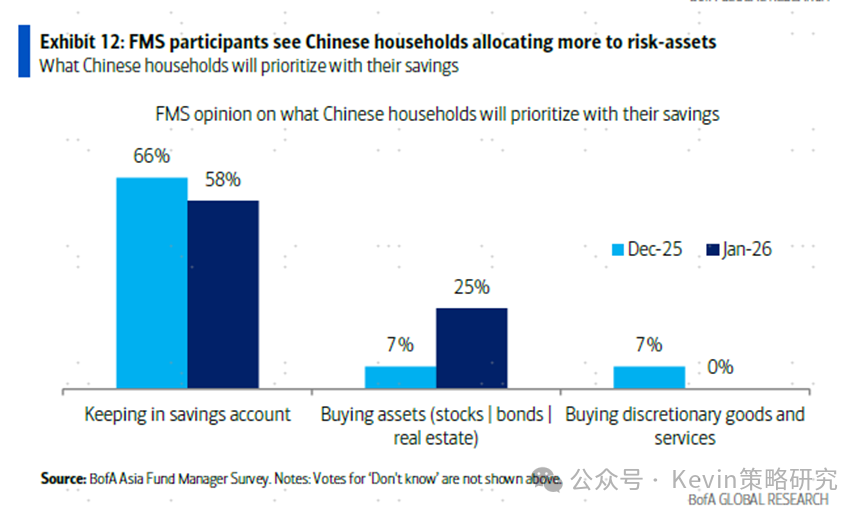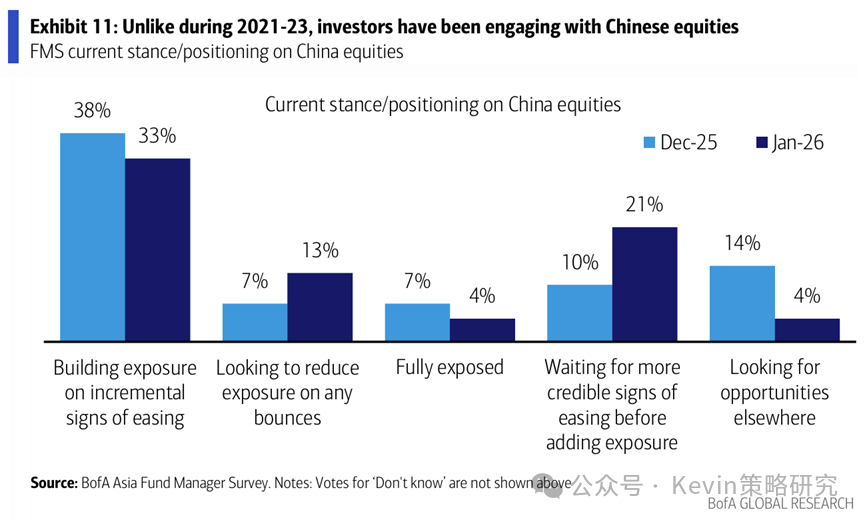 2. 相比12月,更多人想要等更确定宽松信号后再加仓(21% vs. 12月10%),以及在市场反弹后获利了结(13% vs. 12月7%);25%的人认为中国居民配置风险资产(vs. 12月7%)