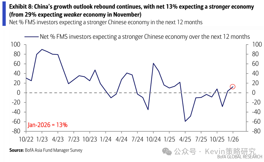 1. 认为中国经济未来12个月走强的人从12月的3%继续走高至1月的13%