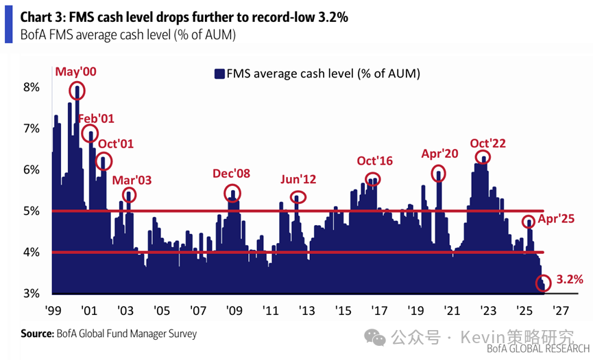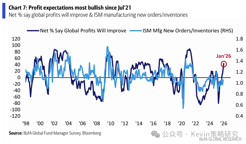 1. 全球投资者情绪为2021年7月以来新高,现金比例由12月的3.3%进一步降至3.2%的新低