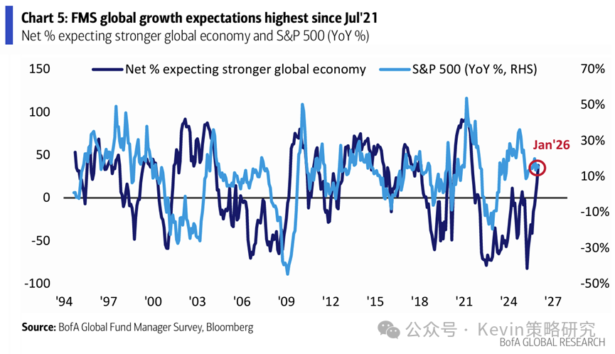 1. 全球投资者情绪为2021年7月以来新高,净38%的投资者对全球经济增长和标普500走势更乐观,现金比例由12月的3.3%进一步降至3.2%的新低