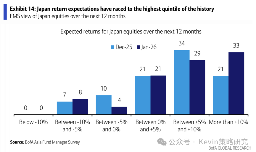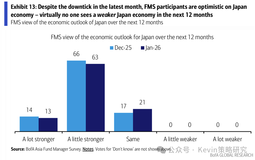 3. 投资者对日本经济进一步乐观,几乎无人预计未来12个月内日本经济将走弱; 33%的人认为未来12个月日股回报会超过10%