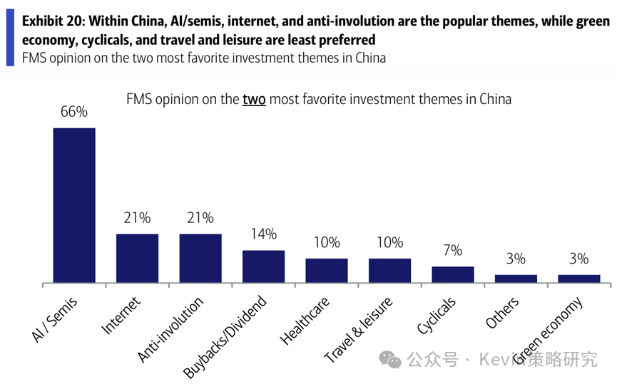 5. 中国市场内部,外资最看好的主题中,AI和半导体(66%)维持第一位,其次是互联网和反内卷(21%),然后是分红(14%)