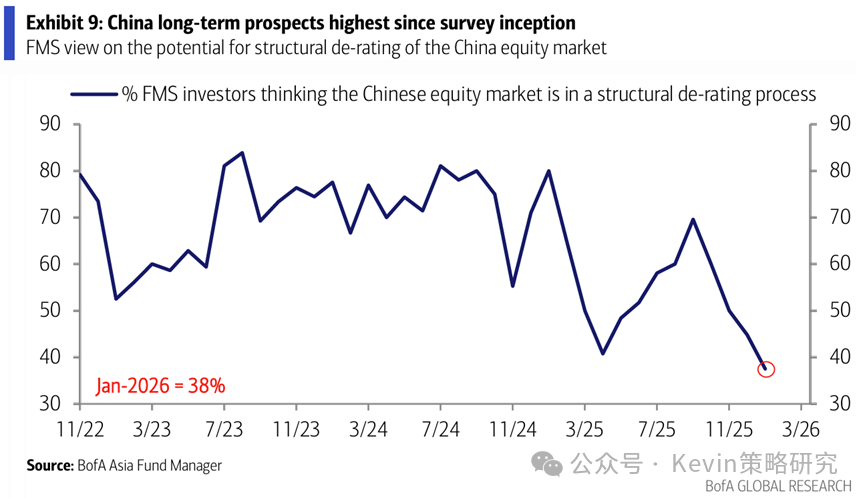 投资者对长期的结构性前景持续改善,创该调查以来新高,认为处于结构性的估值下行的比例降至38%(vs. 12月45%)
