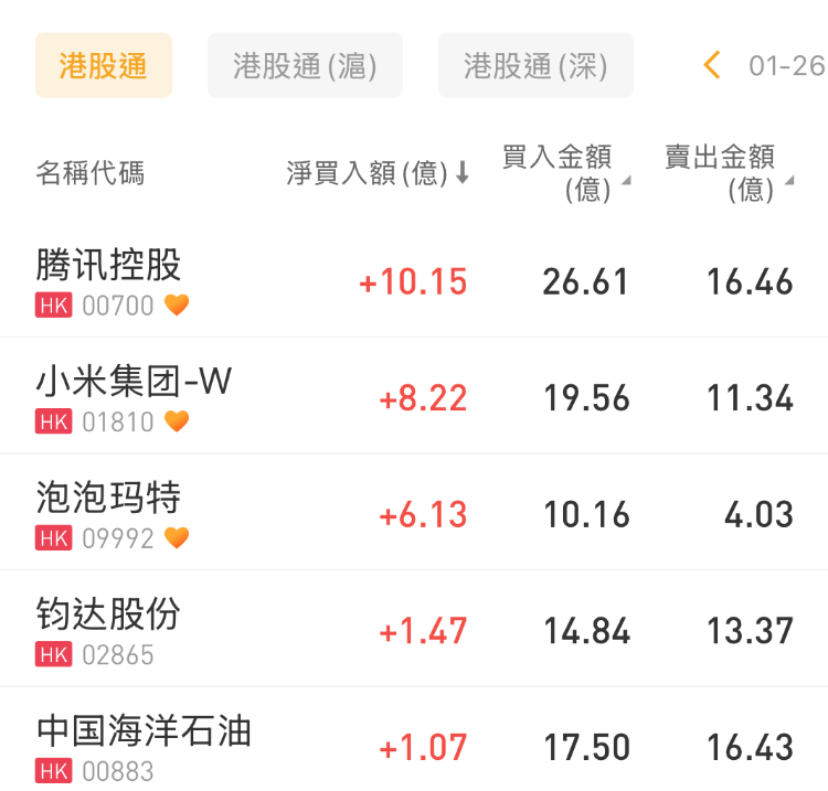 腾讯(00700)获净买入10.15亿港元。消息面上,1月26日,腾讯董事会主席马化腾在公司年会上定调2025年为“AI大年”,并宣布旗下AI应用“元宝”将于2月1日启动春节分10亿元现金活动。马化腾明确表示,希望通过此次高额补贴,重现当年微信红包“摇一摇”绑定数亿用户的盛况。