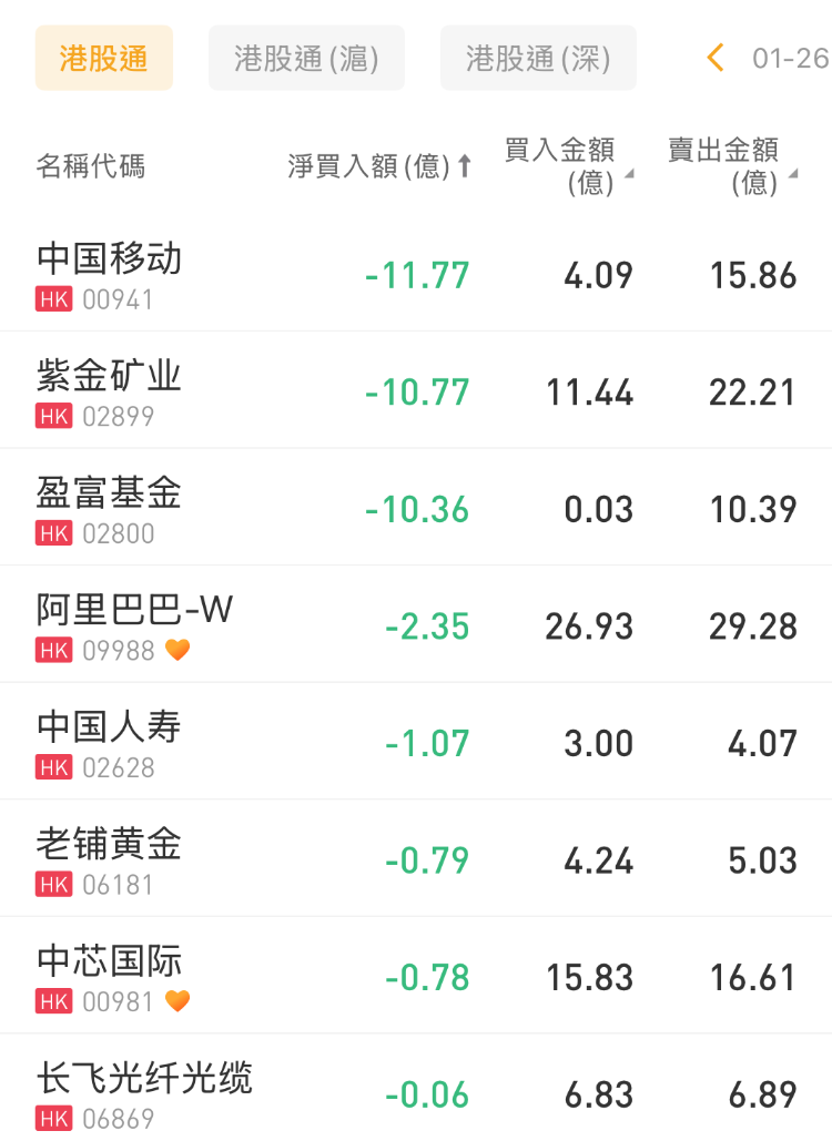 紫金矿业(02899)遭净卖出10.76亿港元。消息面上,据紫金矿业官微消息,1月23日,紫金矿业旗下巨龙铜矿二期改扩建工程正式建成投产,达产后将形成35万吨/日的总生产规模。而据上海证券报报道,今日A股尾盘集合竞价阶段再现异常波动,多只核心权重股同步出现巨额卖单压盘现象,其中紫金矿业压单金额超40亿元。