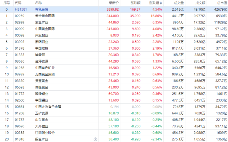 华盛资讯1月27日讯,港股有色金属概念股盘中上扬!紫金黄金国际大涨近17%,紫金矿业涨超6%,洛阳钼业、中国宏桥涨超2%,赣锋锂业微涨,赤峰黄金跌幅收窄。