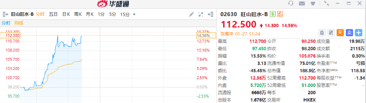 旺山旺水-B涨超14%,高见112.7港元创上市新高。截至发稿,涨14.56%,报112.5港元,成交额2115万港元。