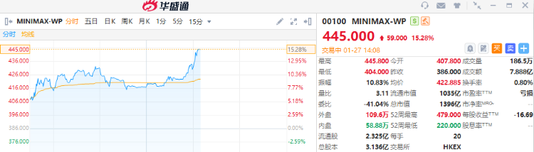MINIMAX-WP短线急升!截至发稿,涨15.28%,报445港元,成交额7.888亿港元。