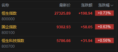 今日港股三大指数集体高开,恒指开盘涨0.73%,报27325.89点,恒科指涨0.56%,国企指数涨0.63%。盘面上,科网股普遍上涨,京东、联想涨超1%;电力设备股高开,哈尔滨电气涨超2%;创新药概念活跃,先声药业涨超5%;黄金股普涨,赤峰黄金涨超4%;鸣鸣很忙首日上市,高开逾88%。